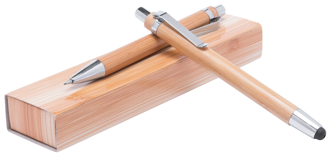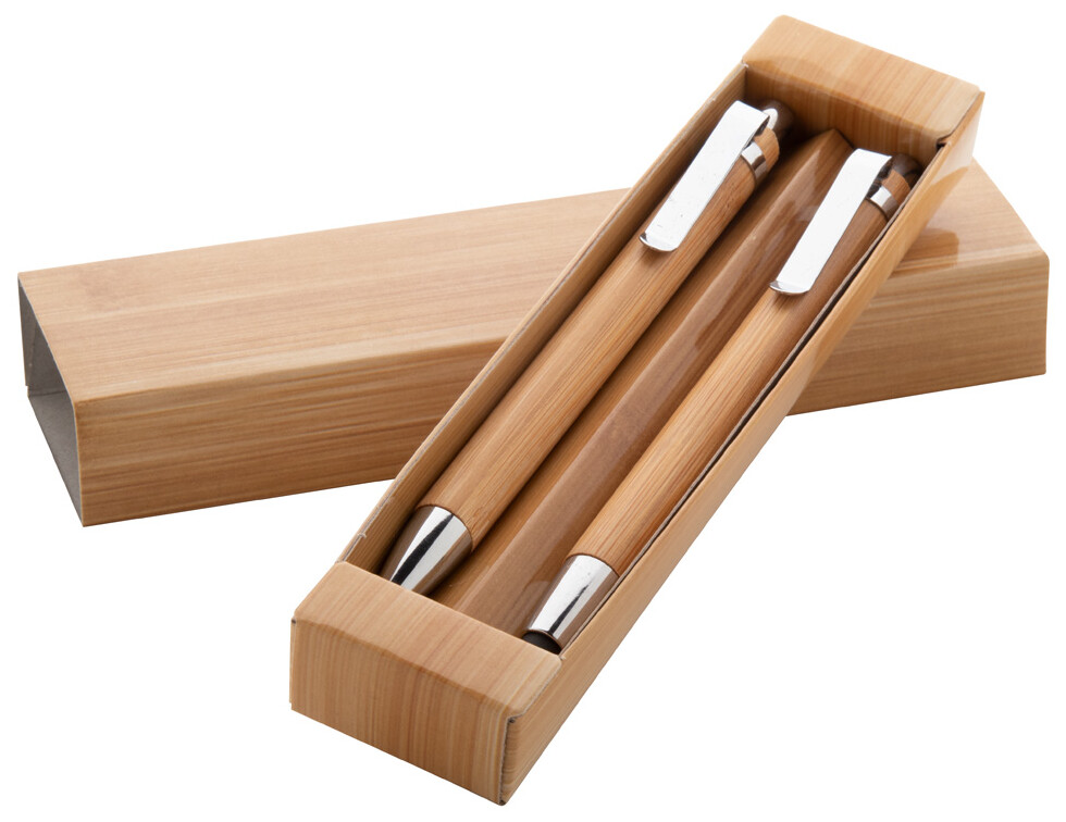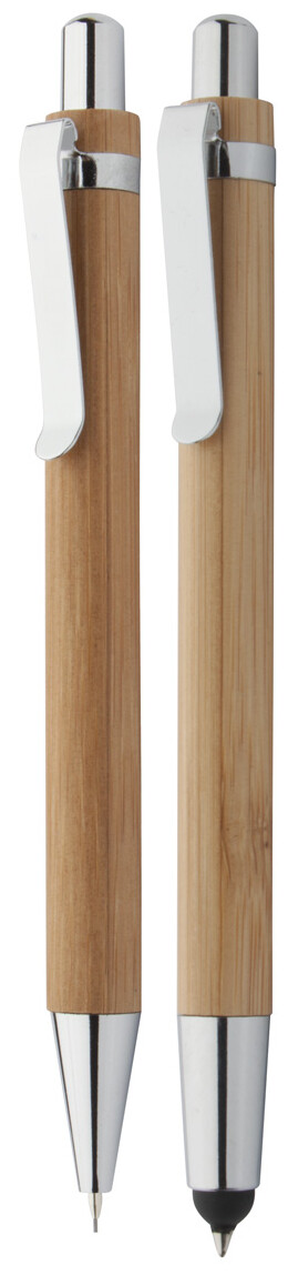 Psací sada z bambusu s dotykovým kuličkovým perem s modrou náplní a mechanickou tužkou se 0,7 mm tuhami, v dárkové krabičce.