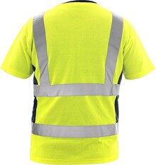 Výstražné tričko s kulatým průkrčníkem v kontrastní modré barvě, krátký rukáv, reflexní pruhy: 2 horizontální, 2 vertikální (šíře 5 cm), po stranách panely ze síťoviny v modré barvě. Doporučené použití: stavebnictví, silničáři, řidiči, logistika, údr