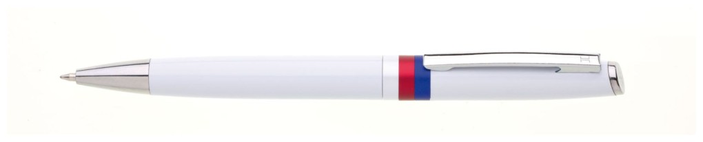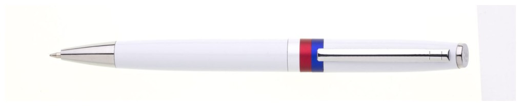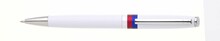 Bílá otočná propiska s trikolórou a tiskem lva. Náplň velkoobsahová, modře píšící.