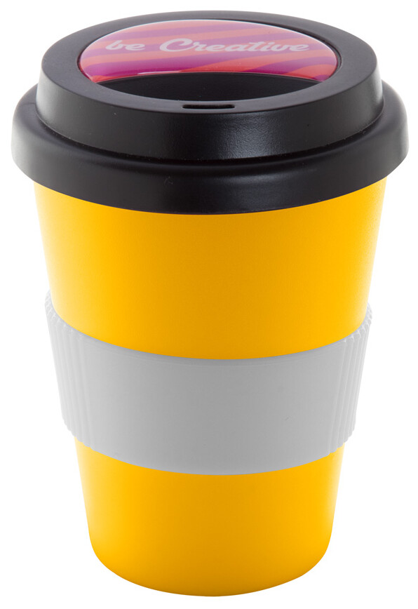 Dvoustěnný plastový termo hrnek s víčkem na pití a silikonovým úchopem na zakázku. 300 ml. Min. mn.: 50 ks.