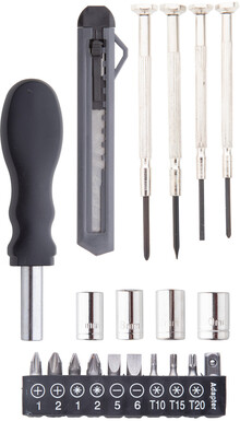 Sada nářadí, 20 dílů, v plastovém obalu ve tvaru kola od auta.