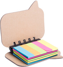 Blok s různě barevnými samolepícími lístky (100 ks 5,1x7,5 cm a 125 ks 1,5x5,1 cm), ve spirálové vazbě s deskami ve tvaru bubliny z recyklovaného papíru.