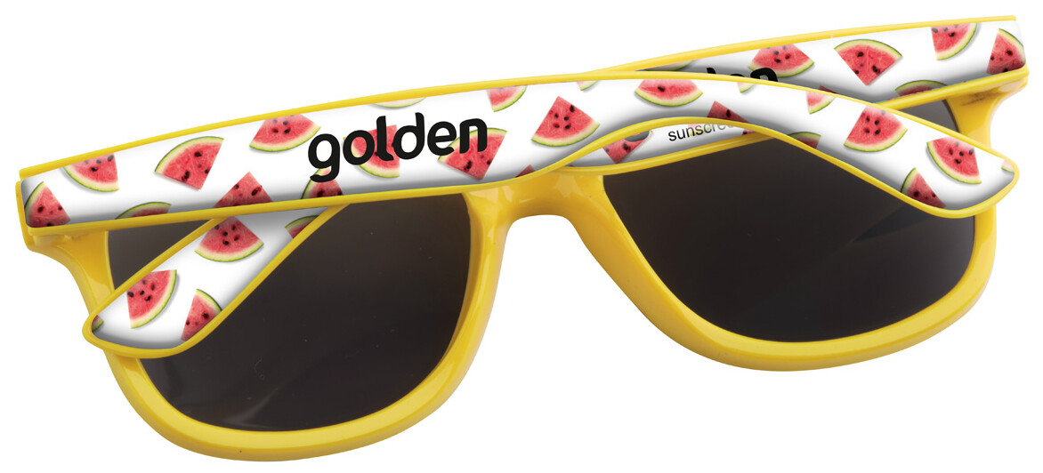 Plastové sluneční brýle se speciálními nožičkami pro epoxy potisk. S ochranou UV 400. Cena zahrnuje epoxy potisk na nožičkách, nezahrnuje tiskovou přípravu. Min. mn.: 100 ks.