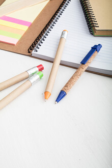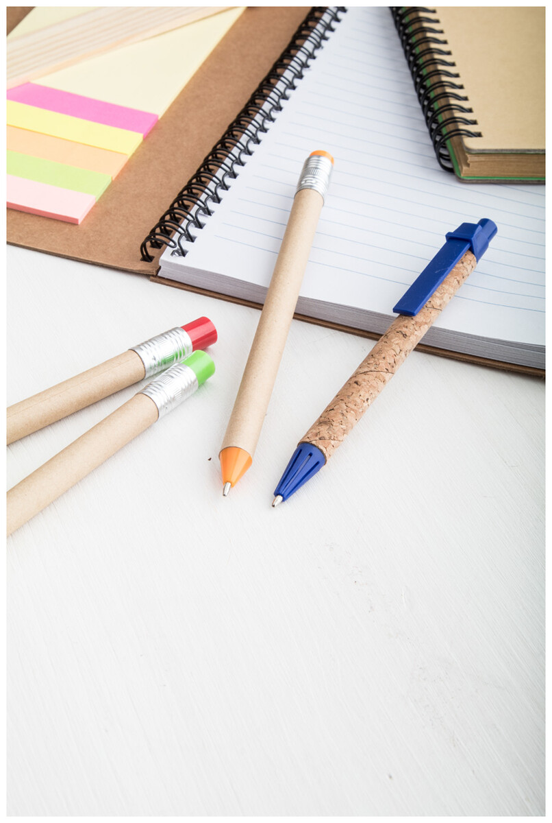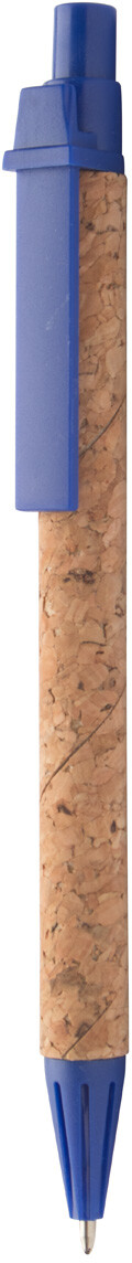 Kuličkové pero z recyklovaného papíru s korkovým povrchem a plastovými částmi, s modrou náplní.