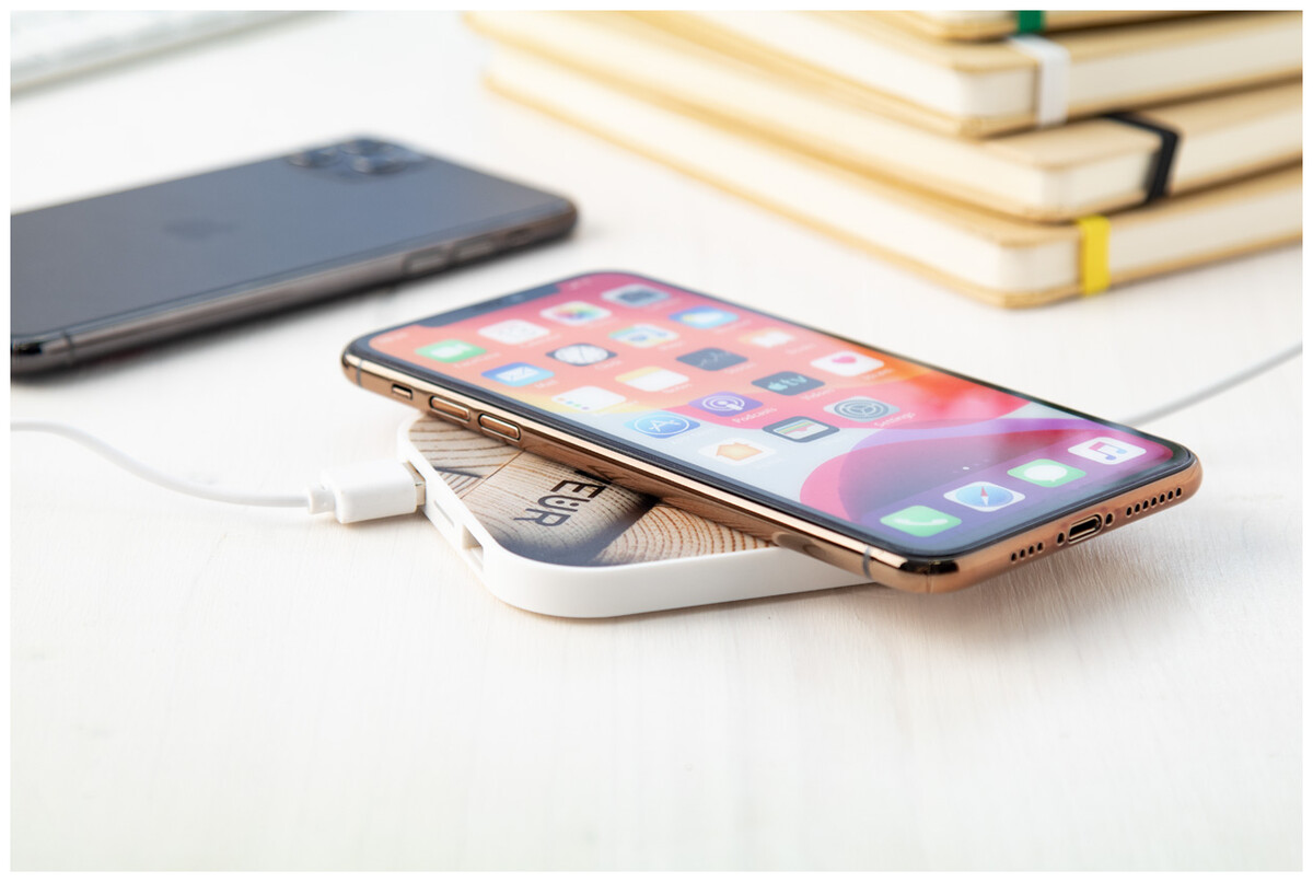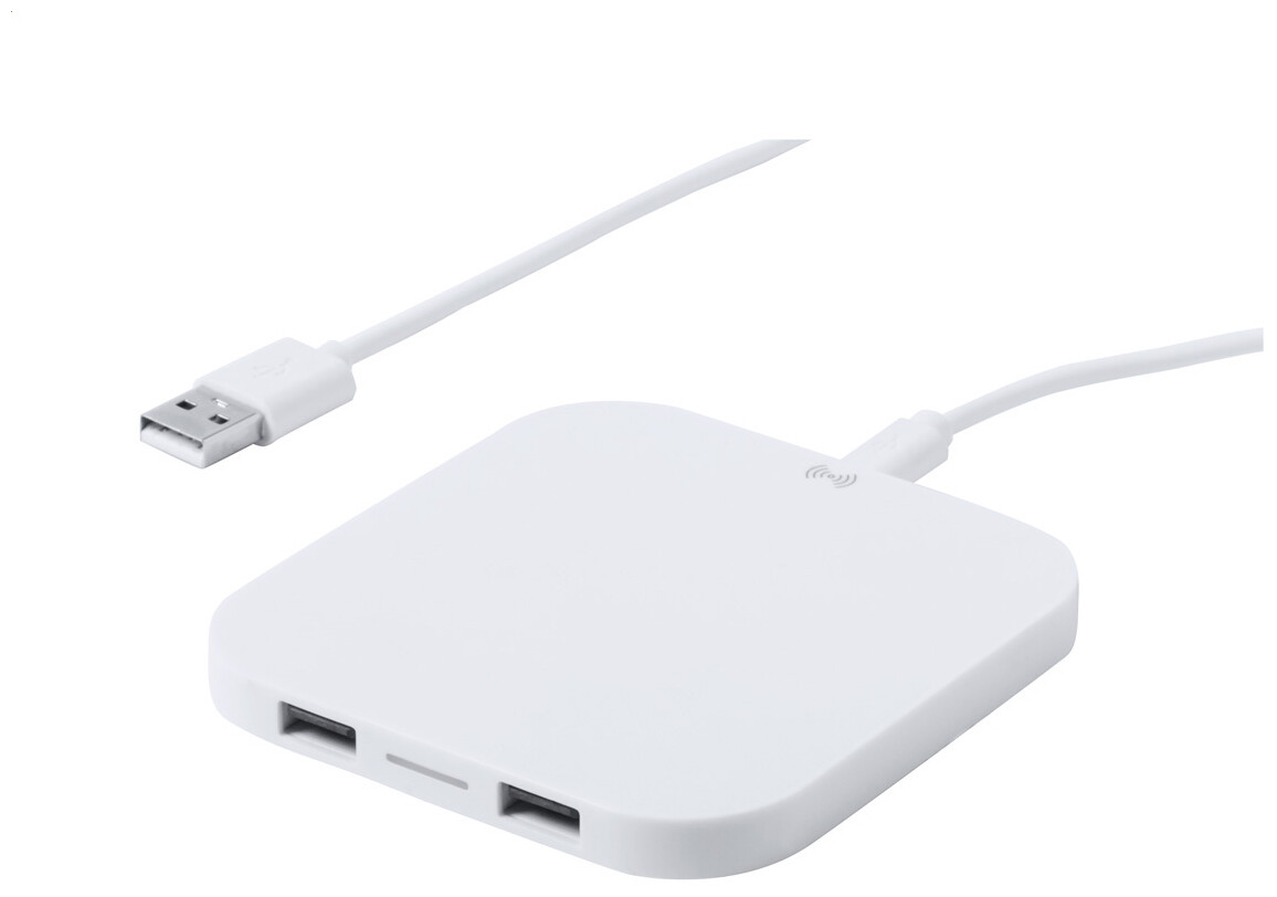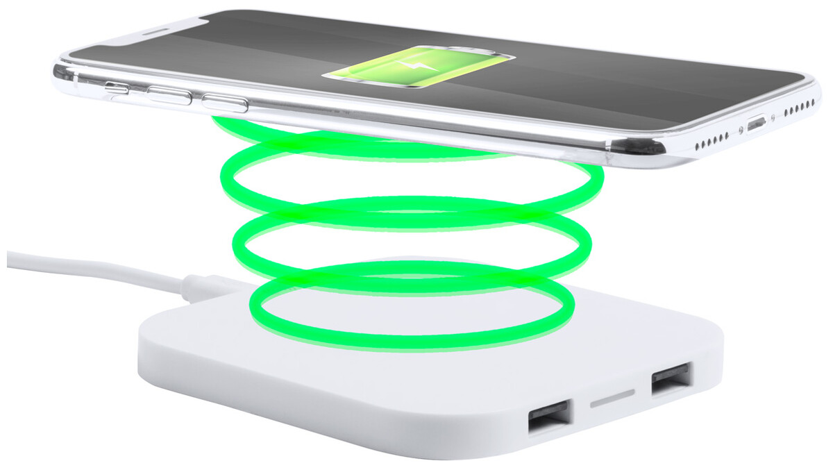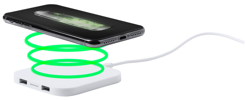 Plastová bezdrátová nabíječka (10W) na mobil s 2 USB porty. Max. výstup 2100 mA.