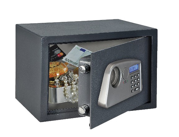 Nábytkový sejf s vnějšími rozměry 350 x 250 x 250 mm a vnitřními rozměry 345 x 240 x 190 mm, zamykání sejfu na elektronický kód.