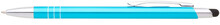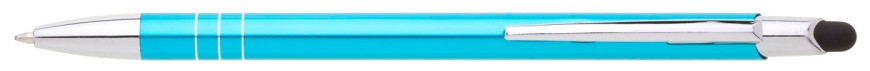 Tenká kovová propiska SOTTI s touch koncem v tyrkysové barvě s chromovými doplňky a třemi tenkými proužky. Náplň X-20, modře píšící.