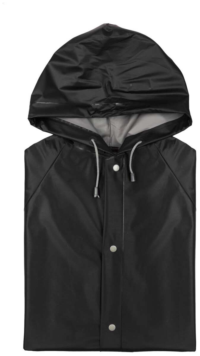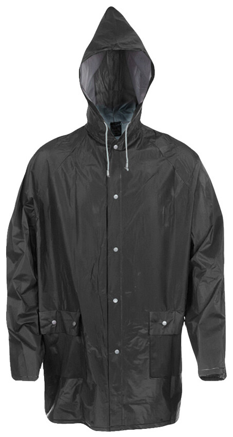 Pláštěnka s kapucí z odolného PVC s žáruvzdornou povrchovou úpravou. Se zapínáním na knoflíky a dvěma předními kapsami.