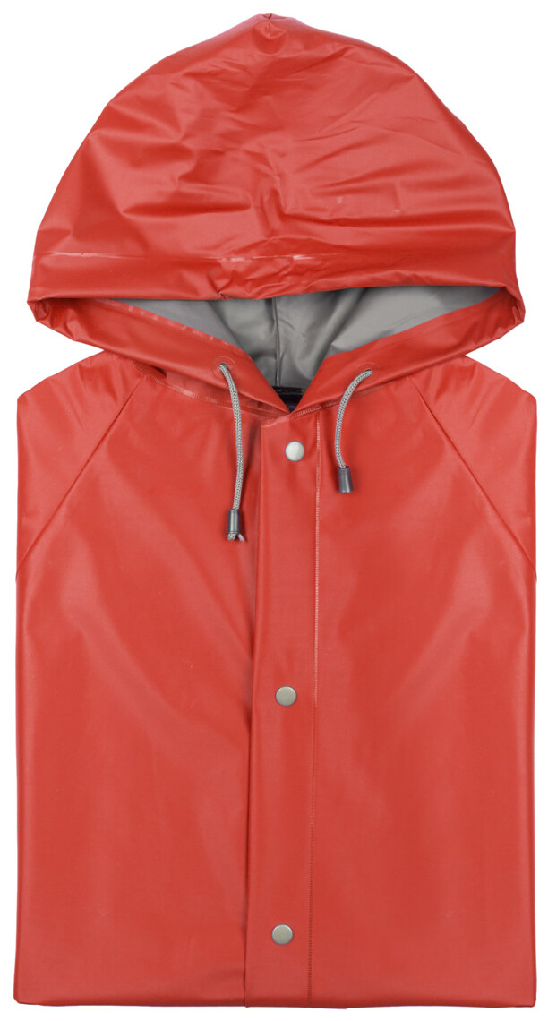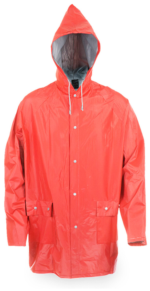 Pláštěnka s kapucí z odolného PVC s žáruvzdornou povrchovou úpravou. Se zapínáním na knoflíky a dvěma předními kapsami.