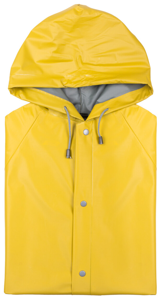 Pláštěnka s kapucí z odolného PVC s žáruvzdornou povrchovou úpravou. Se zapínáním na knoflíky a dvěma předními kapsami.