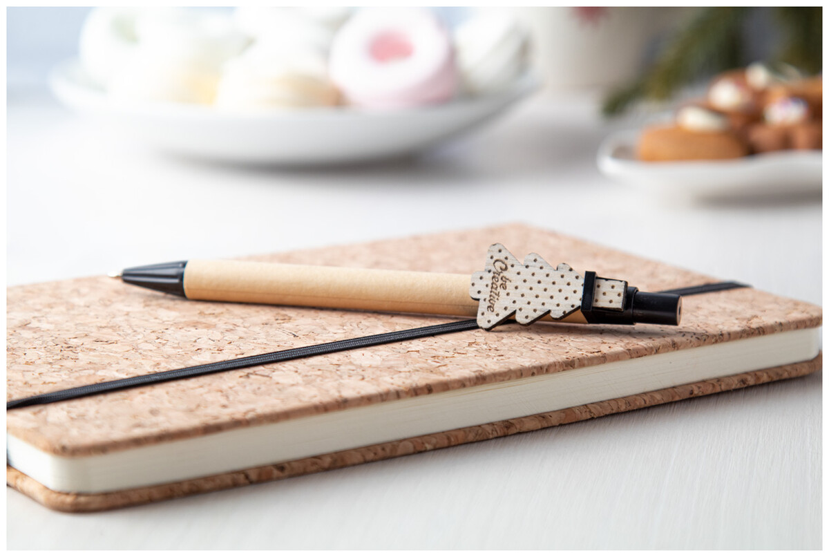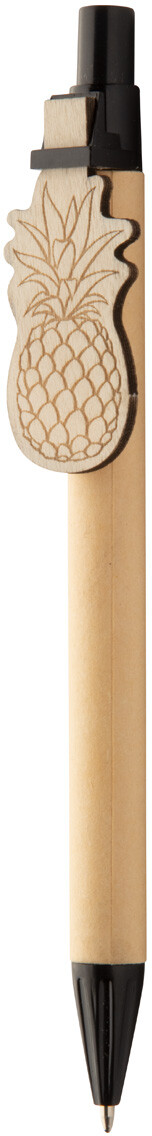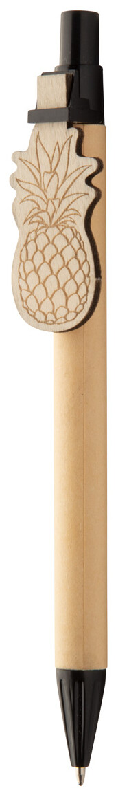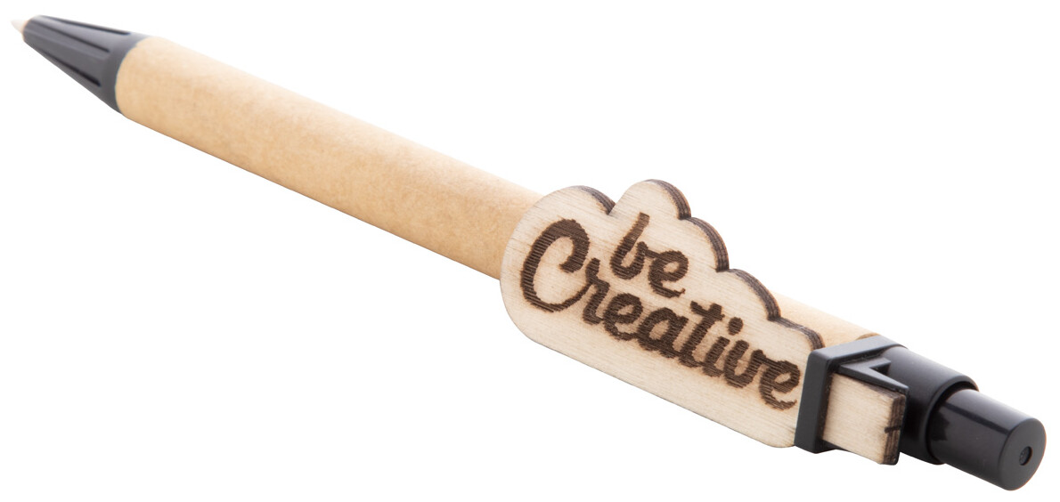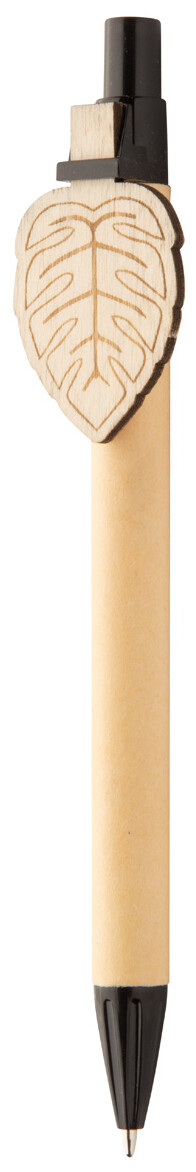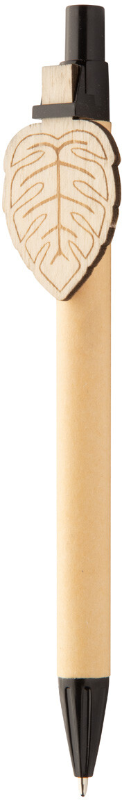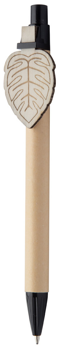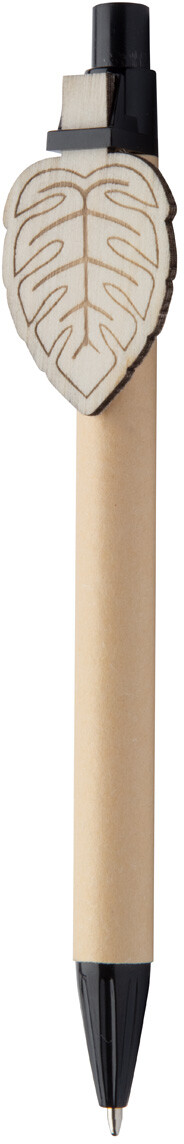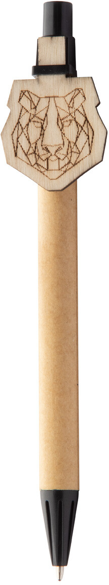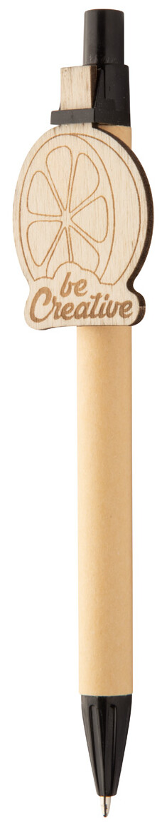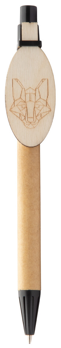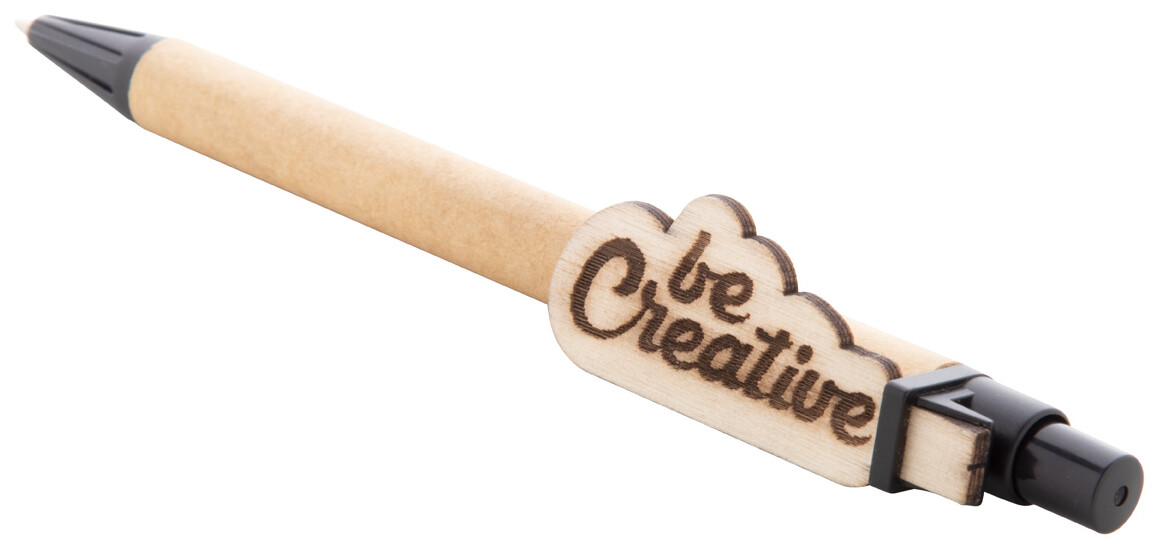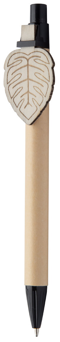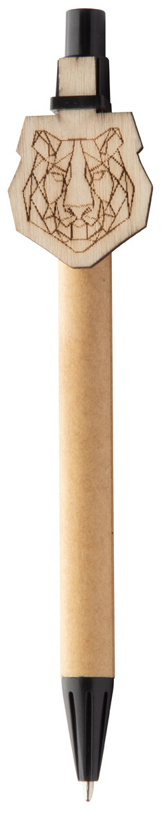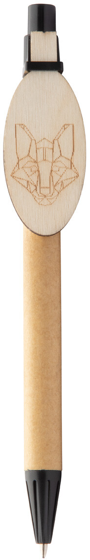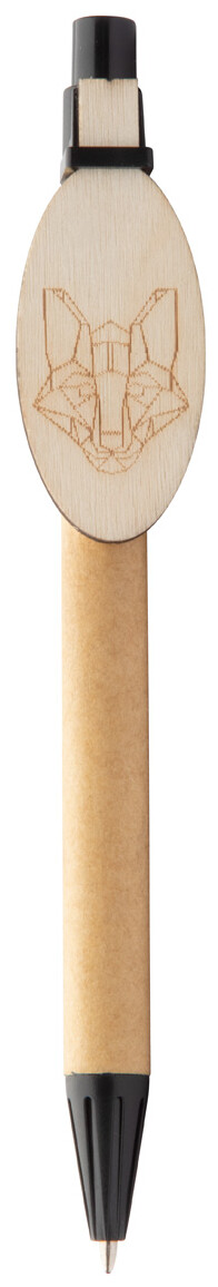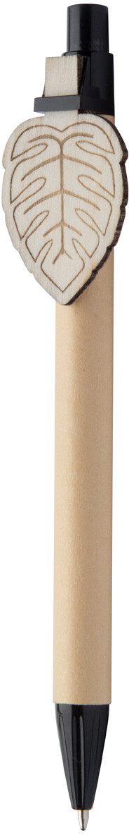 Recyklované papírové kuličkové pero s překližkovým klipem vyrobeným na zakázku a modrou náplní. Klip je vyroben na zakázku - maximální rozměr: 25×35 mm. Cena včetně gravírování loga na klip, nezahrnuje tiskovou přípravu. Min. mn.: 100 ks.