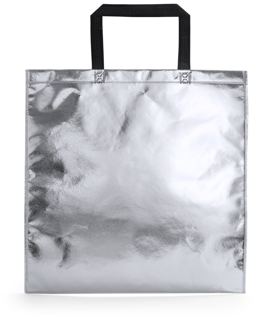 Polaminovaná nákupní taška z netkané textilie v metalické barvě, se středně dlouhými uchy.