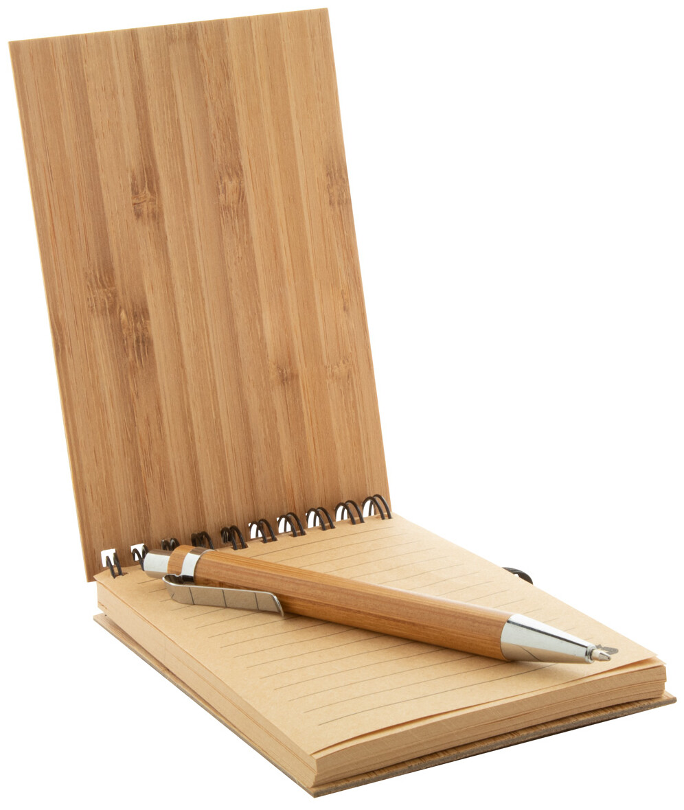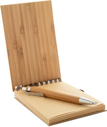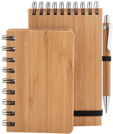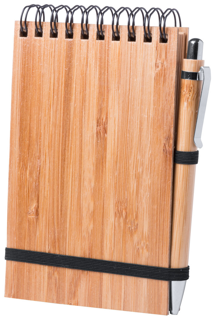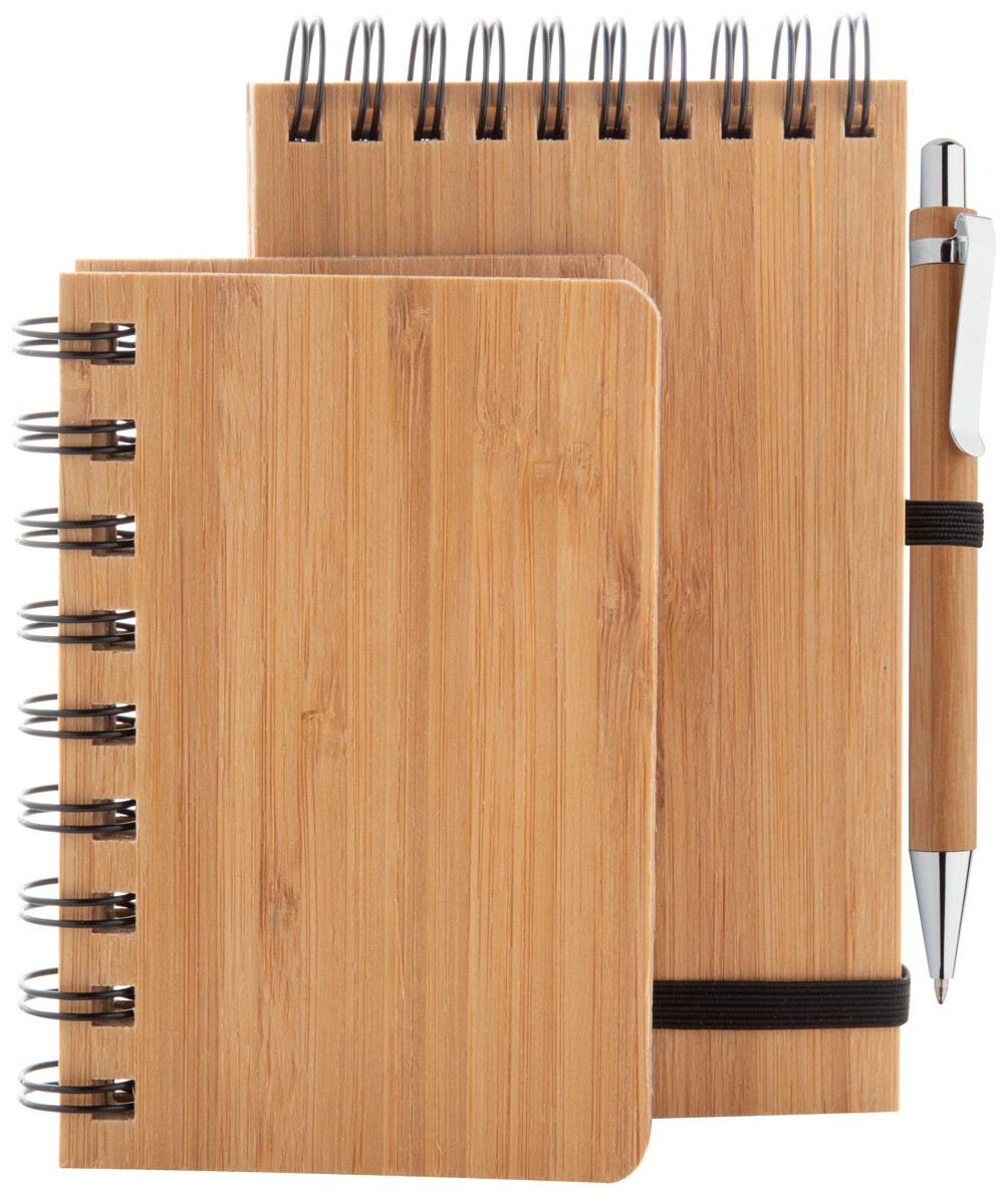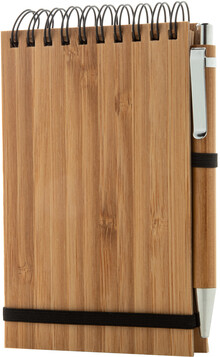Spirálový blok s deskami z bambusu a 70ti linkovanými listy, s bambusovým kuličkovým perem s modrou náplní.