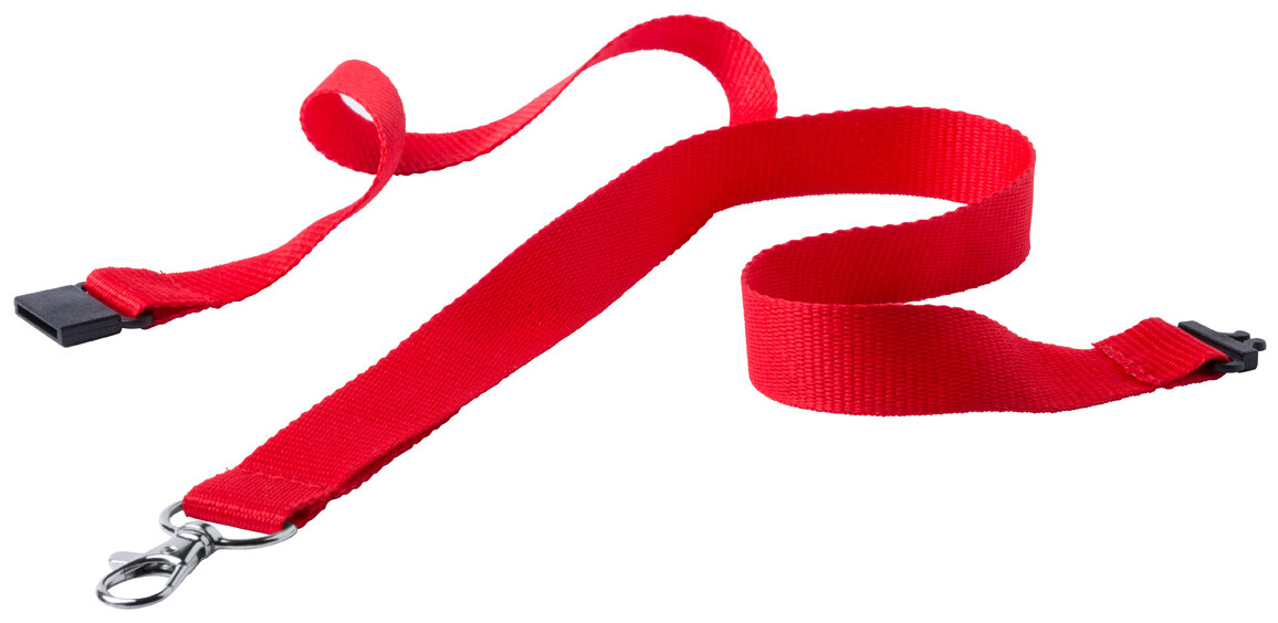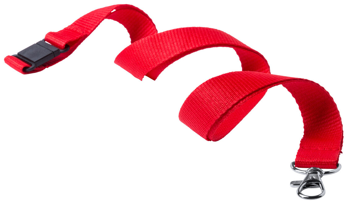 Polyesterový lanyard s kovovou karabinkou a bezpečnostní přezkou.
