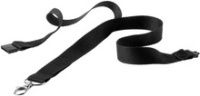 Polyesterový lanyard s kovovou karabinkou a bezpečnostní přezkou.