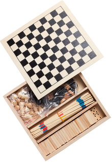 Dřevěná sada her - šachy, domino, mikádo a dáma.