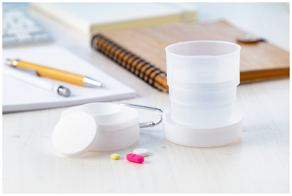 Plastový skládací pohárek s boxem na pilulky. Pouzdro s karabinkou, 220 ml.