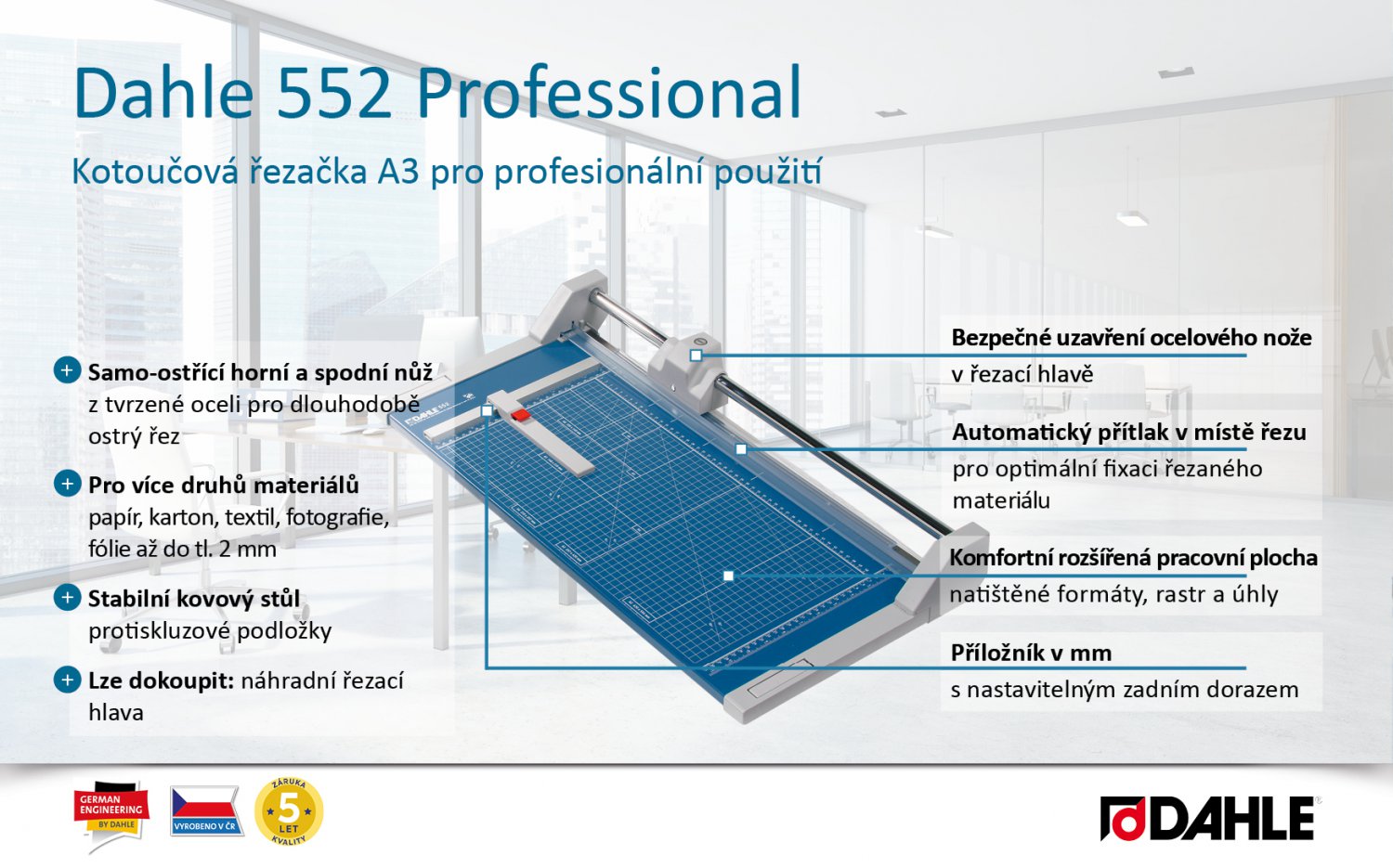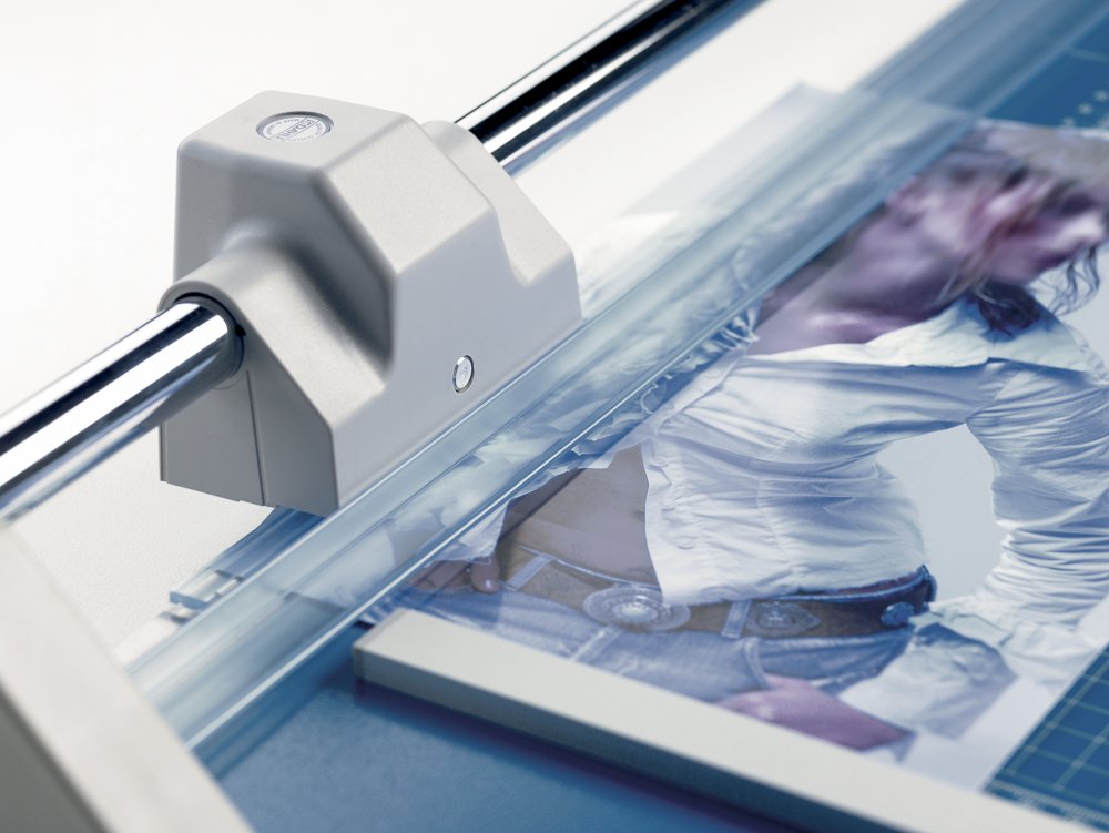 Profesionální kotoučová a velkoformátová řezačka pro každodenní použití. Samo-ostřící horní a spodní nůž z tvrzené oceli pro dlouhodobě přesný řez. Určeno pro více druhů materiálů: papír, karton, textil, fotografie a fólie. Stabilní rozšířený kovový stůl s neklouzavými pryžovými podložkami pro komfortní provoz. Uzavřená hlava nože zajišťuje vysokou míru bezpečnosti. Natištěné úhly, rastr a DIN formáty usnadňují přesné vyrovnání řezaného materiálu. Příložník s dělením v mm a nastavitelným zadním dorazem pro fixaci řezaného materiálu a přesný řez 90°. Automatický přítlak v místě řezu pro rychlé zafixování řezaného materiálu. Pro úsporu místa možnost montáže na stěnu. Lze dokoupit: náhradní řezací hlava. Vyrobeno v ČR. Váha: 3,4 kg. Rozměr stolu: 705 x 360 mm. Délka řezu: 510 mm. Výška řezu: 2 mm. DIN: A3. Řezný výkon: 20 listů papíru (80 g/m2).