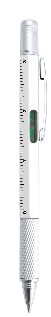 Plastové kuličkové pero s plochými a hvězdicovými šroubováky, vodováhou a pravítkem 7 cm / 3 palce. S kovovým klipem a modrou náplní.
