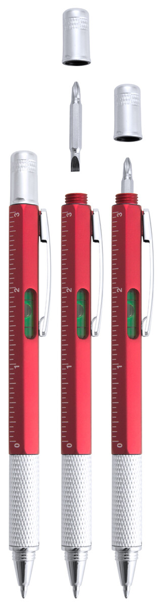 Plastové kuličkové pero s plochými a hvězdicovými šroubováky, vodováhou a pravítkem 7 cm / 3 palce. S kovovým klipem a modrou náplní.