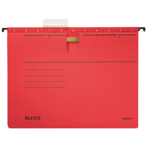Závěsné zakládací desky vhodné pro děrované dokumenty do formátu A4. Pevně zachycený rychlovazačový hřbet umožňuje zakládání jednotlivých spisů. Desky mají výřez pro palec pro snazší uchopení. Součástí je velký plastový rozlišovač, který je umístit na vodorovné i svislé straně desek. Balení 25 ks. Barva: červená.