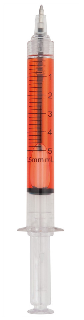 Plastové kuličkové pero ve tvaru injekční stříkačky s průhledným tělem naplněným kapalinou. S modrou náplní.