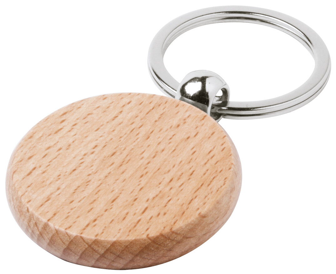 Přívěsek na klíče z přírodního bukového dřeva s kovovým kroužkem.