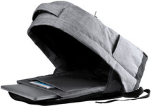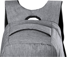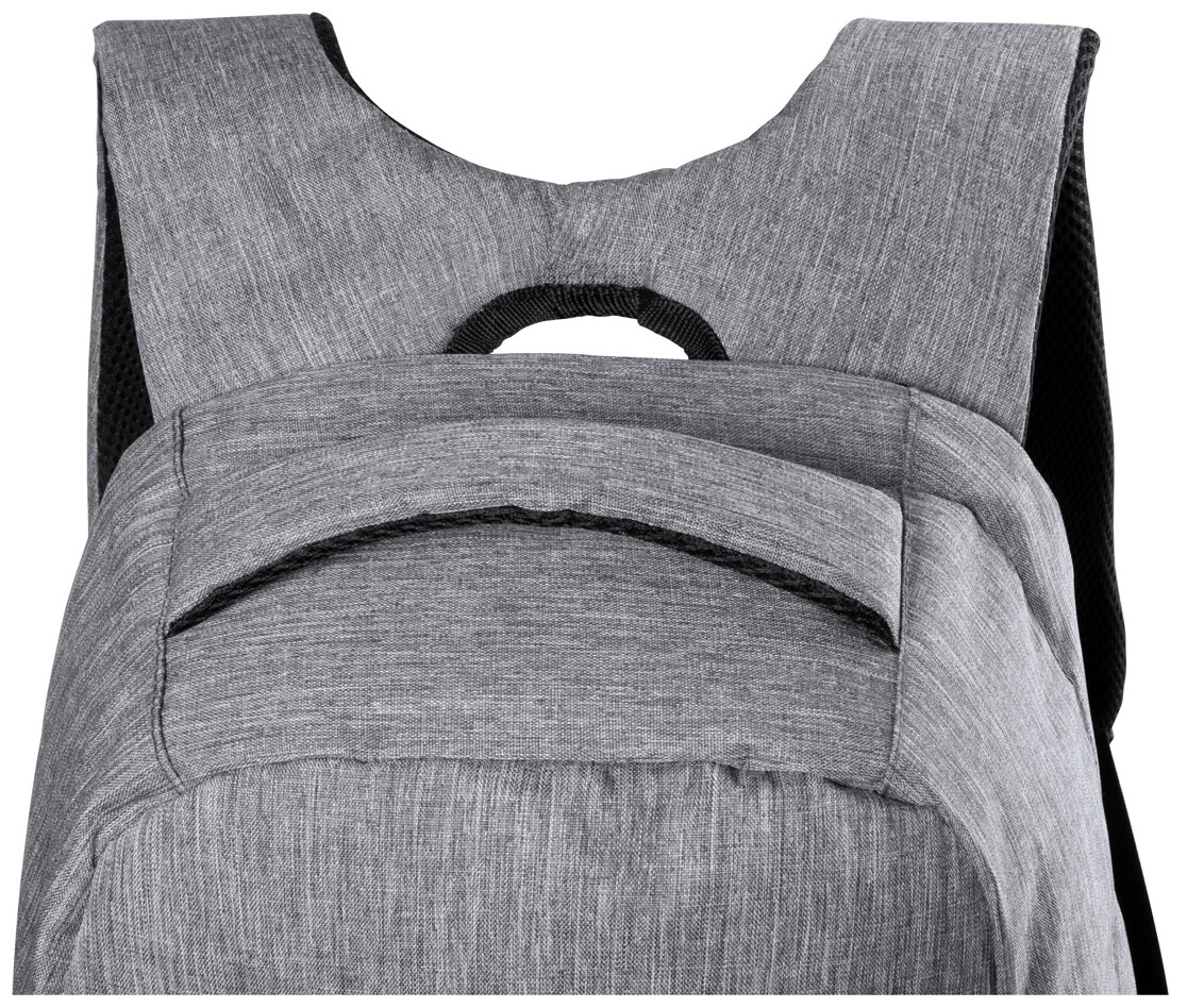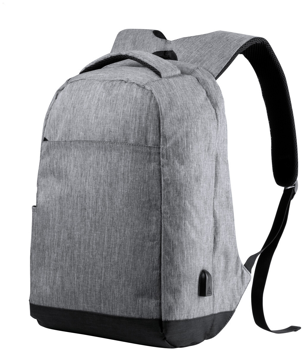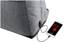 Voděodolný batoh s ochranou proti krádeži s několika přihrádkami na zip, polstrovaným prostorem pro laptop (15 ") a tabletem (12"), polstrovanými zády a ramenním popruhem. S vestavěným USB připojením pro power banky. 300D Polyester.