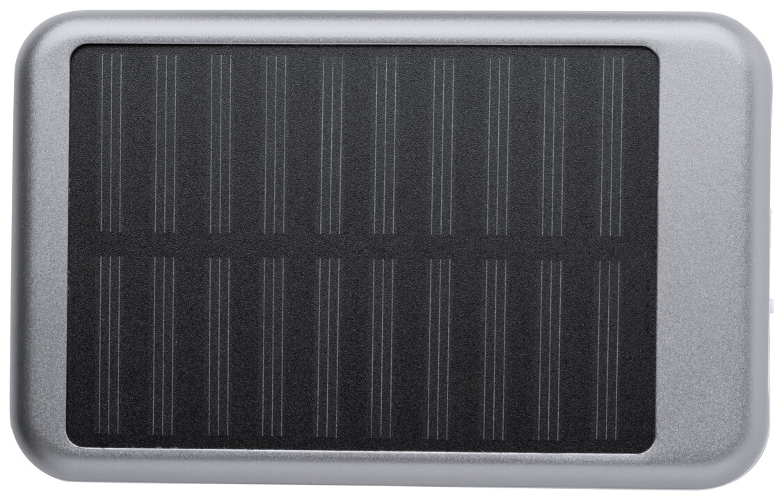 Hliníková USB power banka s 4000 mAh baterií a vestavěnou solární nabíječkou. Vč. micro USB nabíjecího kabelu.