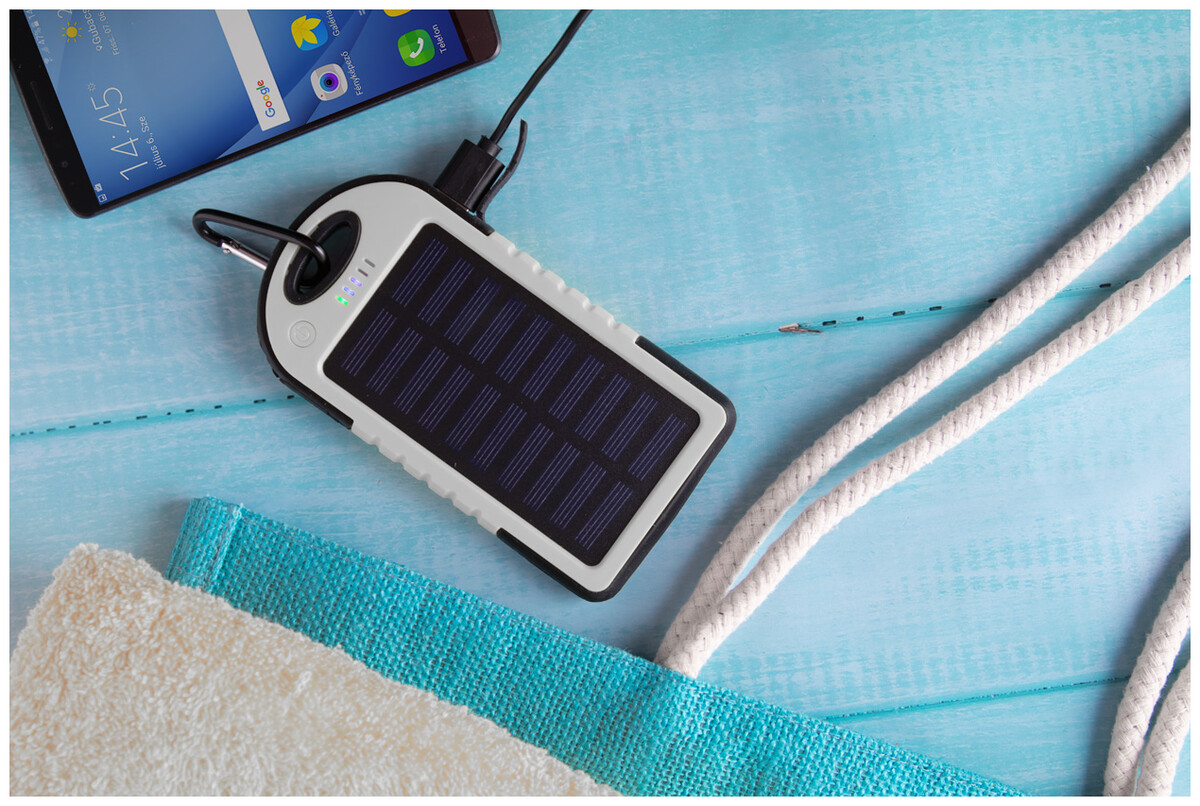 Plast/silikonová power banka s 4000 mAh baterií, solárním nabíjením a 1 LED diodou. Dodáváno vč. USB mikro kabelu.